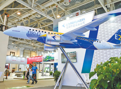 在厦门举行的2024金砖国度新工业创新展巴西展位展出的E190-E2飞机模子。