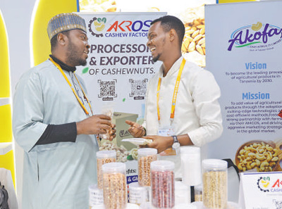 第七届进博会坦桑尼亚馆使命主说念主员正在和客户斟酌。