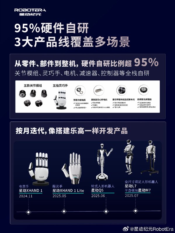 而在硬件层面,公司自研比例超95%,酿成从零件到整机的全链条研发能力,推出星动L7东谈主形机器东谈主、星动Q5轮式东谈主形机器东谈主、星动XHAND系列五指智谋手等中枢居品。