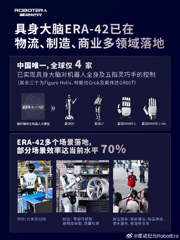 其自研具身大脑ERA-42是国内独一可初始全尺寸双足东谈主形机器东谈主全身及五指智谋手的端到端VLA具身模子,已在物流、制造、交易办事等场景完结落地。